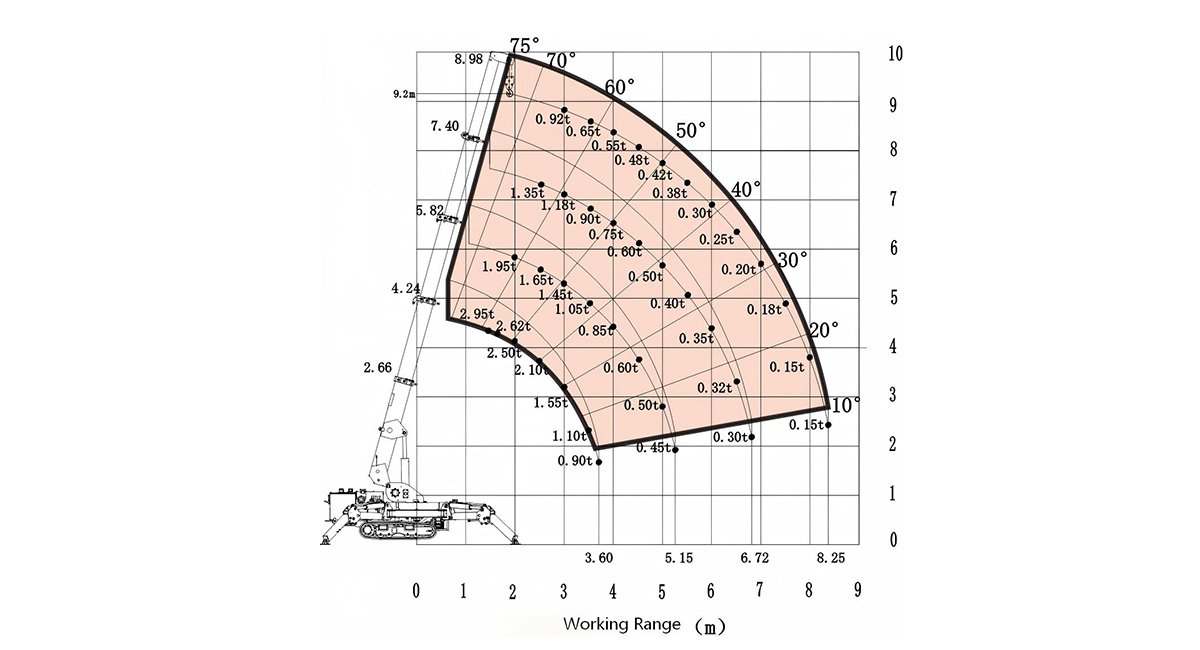 | Max. working radius: 27' 1" @ 330 lbs (8.25m @ 0.15t) | Dimensions (L×W×H): 9' 6" × 31.5" × 5' 7"(2890 × 800 × 1700 mm) |