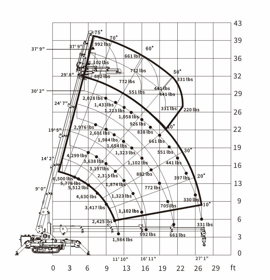 | Max. Working Radius: 27' 1" @ 330 lbs | Dimensions (L×W×H): 9' 10" × 31.5" × 5' 7" |