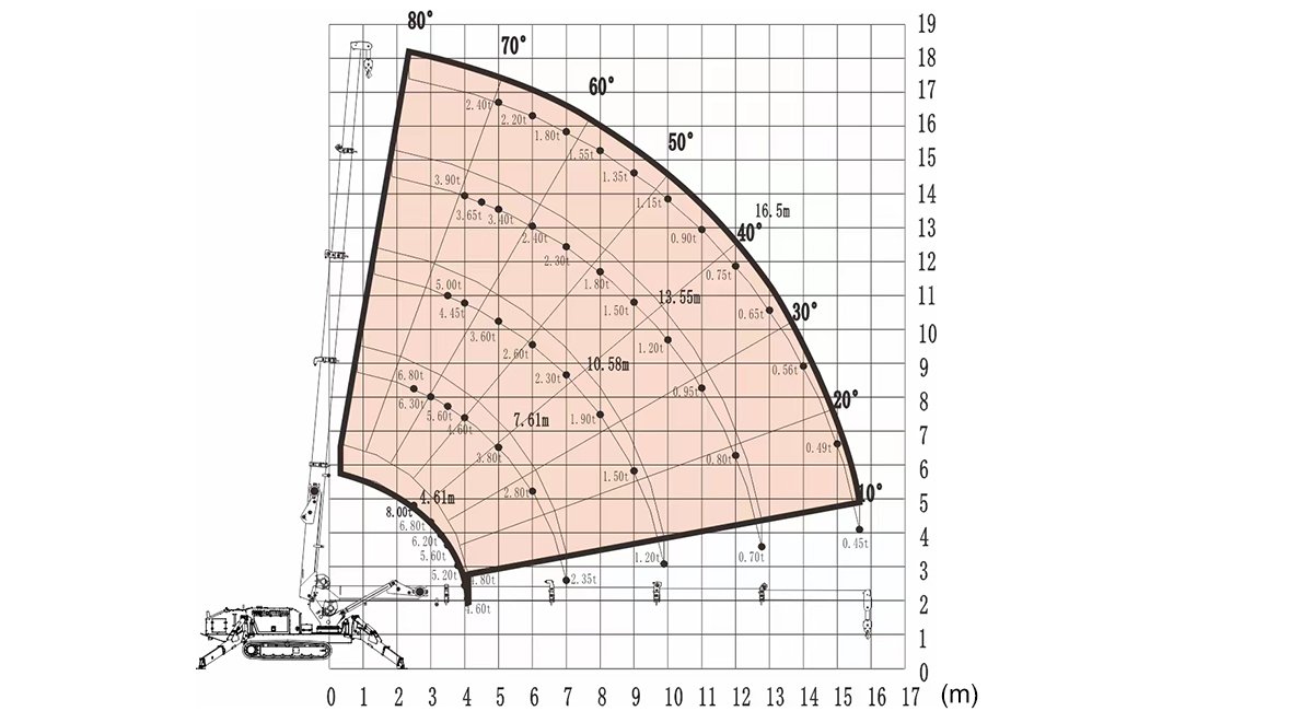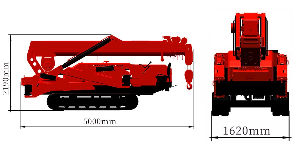 Max. Working Radius: 51' 6" @ 990 lbs (15.7m @ 0.45t) Dimensions (L×W×H): 16' 5" × 63.8" × 7' 2"(5000 × 1620 × 2190mm)